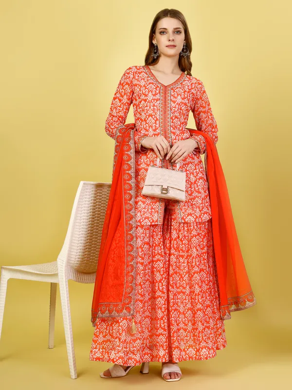 Vibrant Tomato Red Printed Jacket-Gharara-Dupatta Set